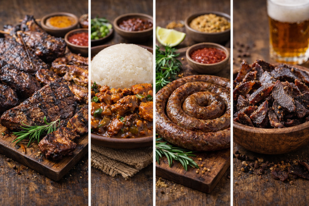 Southern African meals celebrate outdoor cooking and shared moments.